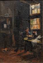 Willem de Zwart (1861-1931), interieur met figuur aan tafel, olieverf op paneel, r.o. gesigneerd, 29 × 19,5 cm