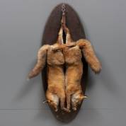 Paar geprepareerde vossen op eiken wandplaat -kleine defecten aan snuit en voorpootje-, hoogte circa 156 cm