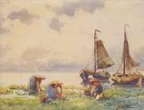 A.C.W. Terhell (1863-1949), sorteren van de vangst, aquarel, r.o. gesigneerd J. le Blanc, 35,5 × 27,5 cm