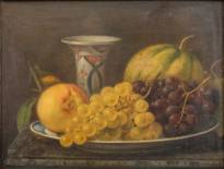 Cornelis Bernardus Buys (1808-1872), stilleven met fruit en porselein, olieverf op paneel, r.b. gesigneerd en gedateerd 1856, 26,3 × 34,4 cm