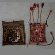 Twee Perzische kussens: Belouche en Luri soumaktasje met diermotieven vermaakt tot kussentje, 44 × 42 en 38 × 33 cm