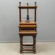 Kleine eiken linnenpers met gezwarte accenten, het onderstel met gedraaide poten en regelverbinding, voorzien van zes persplanken, Hollandse renaissance -slijtages en kleine restauraties-, 151 × 54 × 49 cm