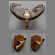 Moeflonhoorns met schedel op houten wandplaat, en paar reehoeven vermaakt tot kapstokjes, moeflon circa 33 × 43 cm