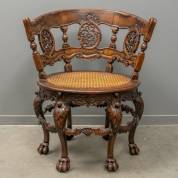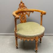 Notenhouten bureaustoel met halfronde rug, gestoken met gotische ornamenten, in schildje een monogram, eind 19e eeuw -stof langs de rand een beetje sleets-, 68 × 98 × 70 cm
