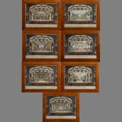 Amsterdamsche Schouwburg - Acht decorprenten met toneelscènes. Ingekleurde gravures, goud gehoogd, met aangehecht onderschrift (titel en vierregelig vers), circa 1768. Uniform ingelijst. Gezicht vanuit de zaal over de orkestbak, stalles en staanplaatsen heen, met aan weerszijden balkons en schutschermen met corinthische zuilen die het lijsttoneel vormen boven vier kroonlijsten; de geanimeerde voorstellingen op het toneel binnen acht perspectivische zijschermen. De titels zijn ontleend aan de gangbare genres (onder andere 'De Italiaansche Straat', De Gestoffeerde Kamer', De Berg van Parnas', 'Het Bosch, 'De Hel', 'Het Nieuwe Hofportaal') -enkele krassen op de lijsten-, circa 34 × 45 cm