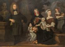 Vermoedelijk Hollandse School: familieportret met ouders en vier kinderen, in een tuin met barokke ornamenten en fleur-de-lis in een wapenschild, olieverf op doek, eind 17e/begin 18e eeuw -restauraties-, circa 122 × 168 cm