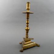 Spaanse bronzen kandelaar op driehoekige voet, 17e/18e eeuw -kaarsvet-, 34 cm