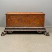 Cipreshouten kist met ingeponst decor op het front: processie van figuren en paarden, het deksel met decor in zwarte inkt: figuren en figuratieve banden en cirkels, staand op gesneden houten onderstel met klauwpoten, Noord-Italië, waarschijnlijk 17e eeuw met latere aanpassingen -binnenbakje ontbreekt, poten gammel-, 80 × 180 × 70 cm