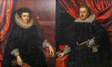 Hollandse School: paar pendantportretten, de man en vrouw beide in zwarte kledij, hij met platte kraag en zij met molensteenkraag, beiden met rode draperie in de achtergrond, niet gesigneerd, het mannenportret gedateerd 1616, in gesneden en vergulde houten lijsten, vermoedelijk latere kopieën naar familieportretten van de familie De Ligne van Marcus Gheeraerts II (1561-1636) -beide bedoekt, witte verf transparant geworden in molensteenkraag-, 99 × 80 cm