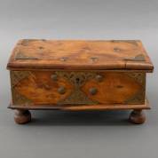 Koloniale documentenkist met messing beslag, staand op bolpoten, 19e eeuw -deksel getordeerd-, 19 × 36,5 × 24,5 cm