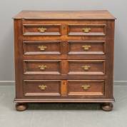 Eiken ladekast, de vier lades met messing beslag, de zijkanten met panelen, staand op bolpoten, Engeland, 17e/18e eeuw -blad met krimpscheur en defecten-, 97 × 102 × 60 cm