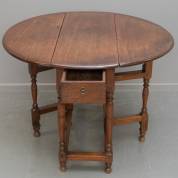 Eiken gateleg-tafel met gedraaid onderstel en twee lades, Engeland, 19e eeuw -gebruikssporen-, ingeklapt 97 × 112 × 42 cm, uitgeklapt circa Ø 112 cm