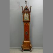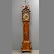 Amsterdams staand horloge in noten en wortelnoten kast, staand op klauwpoten, de wijzerplaat met aanduiding van uren, minuten, seconden, kalender en maanstand, voorzien van wekkerwerk en slagwerk op uren en halfuren, de messing wijzerplaat met verzilverde cijferring, voorzien van gegoten hoekstukken, voorstellende de vier jaargetijden, gesigneerd Jan Tinkingh (Jan Tenking), Amsterdam, circa 1740, hoogte circa 285 cm
