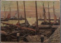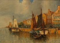 Hans Johann Wagner (1866-1940), kade met aangemeerde boten, olieverf op doek, l.o. gesigneerd, 74 × 100 cm
