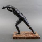 Bronzen beeld: de 'Borghese gladiator', naar hellenistisch voorbeeld, 19e eeuw -slijtageplekjes in patina-, 26 cm hoog inclusief natuurstenen basement