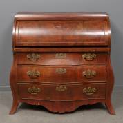 Mahoniegefineerd cilinderbureau met gebombeerd front, de klep met geblokte bies, Louis Quinze -enkele fineerschades, zijkanten met krimpscheuren-, 114 × 124 × 62 cm
