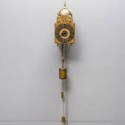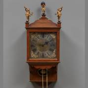 Amsterdamse wandklok in eiken kast, belijmd met een gemoesteerd fineer, mogelijk esdoorn, de wijzerplaat omringd door personificaties van de vier seizoenen, met slagwerk op dubbele bel, adres: Otto van Meurs (1714-1783) -achterplaat vernieuwd-, 86 × 35 × 19 cm inclusief beelden