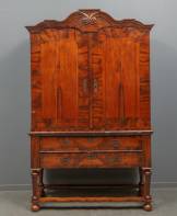 Notengefineerd sterkabinet met twee lades in de onderkast, Hollands, Louis Quatorze -krimpscheuren, diverse defecten aan fineer en profielen-, 210 × 135 × 49 cm