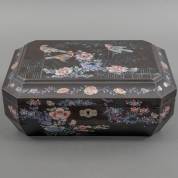Lakwerk handwerkdoos met ingelegd vogeldecor van parelmoer, Japan, circa 1900 -geen sleutel, binnenzijde één knopje missend-, 16 × 40 × 27 cm