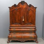 Mahonie kabinet, de bovenkast met medaillons, strikornamenten en pilasters, de dubbelgebogen onderkast met drie lades, het geheel op bolklauwpoten, Hollands, transition, 228 × 180 × 65 cm