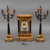 Driedelig bronzen en marmeren pendulestel, de pendule met glazen vensters, geëmailleerde wijzerplaat, kwikslinger en verguld bronzen beslag, geflankeerd door een paar vierlichts kandelabers, eind 19e eeuw, inclusief sleutel, afmetingen pendule 39 × 24 × 14 cm