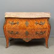 Gebombeerde commode met natuurstenen blad, geheel met rozenhout gefineerd in ruitenpatroon, Louis Quinze-stijl, Frankrijk, 20e eeuw, 84 × 125 × 58 cm