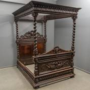 Donkergebeitst eiken, rijk gesneden hemelbed, neorenaissance, 233 × 170 × 212 cm