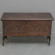 Eiken kist op pootjes met gesneden acanthusbladdecor, 18e eeuw -zonder sleutel-, 55 × 96 × 39 cm