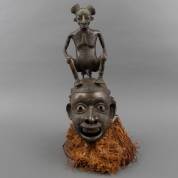 Afrikaans bronzen masker in de vorm van een hoofd met twee gezichten en getooid door zittende vrouw, het hoofddeksel en haar van rattan, Yoruba, Nigeria/Benin -haar gedeeltelijk vergaan-, 65 cm