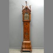 Notengefineerd Engels staand horloge met seconde-, datum- en maanaanduiding, staand op bolklauwpoten, adres: Upjohn & Son, Londen, midden 18e eeuw -watervlekken op onderste gedeelte van de kast, twee kleine stukjes profiel ontbreken onderaan-, 270 × 60 × 33 cm inclusief ornamenten