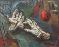 Max Himpe (1920-1975), surrealistische compositie met witte handschoenen, rode bol en huizen, olieverf op board, r.o. gesigneerd, 40 × 50 cm
