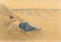 Théophile-Alexandre Steinlen (1859-1923), rustende vrouw bij een hooischelf, pastel, r.o. gesigneerd, 32, 5 × 48 cm