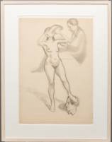Johannes Hendrikus 'Joop' Moesman (1909-1988), studie: vrouwelijk naakt staande op hoofd, potlood op papier, niet gesigneerd, herkomst: Collectie Galerie Jas, Utrecht -papier iets vergeeld, punaisegaatjes in de hoekjes-, 50 × 35 cm