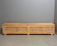 Naaldhouten halbank met intern opbergvak en resten van lichtgele lak, eerste helft 20e eeuw -rekeinde van linker klep losgebroken-, 249 × 49 × 42 cm