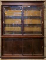 Mahonie inbouwvitrine- of apothekerskast met twee glazen schuifdeuren in de bovenkast en twee dichte schuifdeuren in de onderkast -defecten-, 237 × 183 × 30 cm
