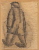 Constant Permeke (1886-1952), lopende man met pet en overjas, op de rug gezien, houtskool op papier, r.o. gesigneerd, 27,5 × 21 cm