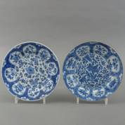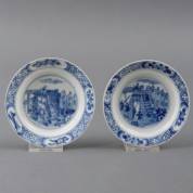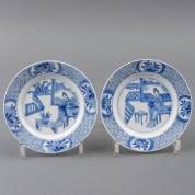Paar Chinees porseleinen schoteltjes met blauw-wit decor: 'Oproer van Rotterdam', jade gemerkt, Kangxi -één met gelijmde rand, ander met chipje en haarlijn-, Ø 11 cm