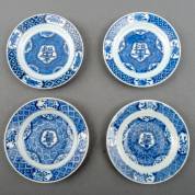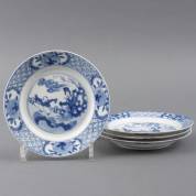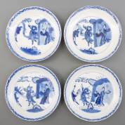 Vier Chinees porseleinen borden met blauw-wit figurendecor: Liu Bei trouwt met de zus van Sun Quan, scène uit de 'Romance of the Three Kingdoms', Chenghua gemerkt, Kangxi -randschilfertjes, één bord met randchipje en gerelateerde haarlijn, één bord met een kleine haarlijn van circa 1 cm-, Ø 21 cm