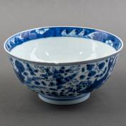 Chinees porseleinen kom met blauw-wit krab- en visdecor, gemerkt, Kangxi -twee randchips met gerelateerde haarlijnen-, 9,5 × Ø 20 cm