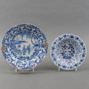 Chinees porseleinen dubbelbord met gecontourneerde en geribbelde rand, waarop blauw-wit decor van figuren op pad langs het water, aan 2e gehalte zilveren hengsel, Kangxi -gelijmd, randchips-, Ø 27 cm, en Chinees porseleinen diep bord, de gecontourneerde rand met blauw-wit bloemdecor en vissen in cartouches, in het plat bloemen op rotsen, gemerkt met bloem, Kangxi -randchips, gelijmd-, Ø 21 cm