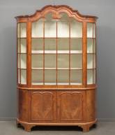 Notenhouten ééndeurs porseleinkast met gecontourneerde kap, ingelegde biezen, afgeronde zijdes en roedeverdeling, de onderkast met twee geprofileerde deuren, tweede kwart 18e eeuw -stukjes lijstwerk ontbreken-, 236 × 162 × 33 cm