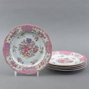 Vijf Chinees porseleinen famille rose borden, de gecontourneerde rand met servetwerk en bloemen in cartouches, het plat met bloemboeket in Europese stijl -defecten-, Ø 23 cm