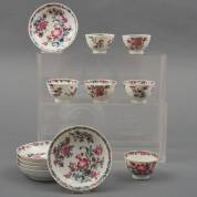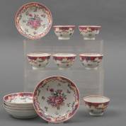 Zes Chinees porseleinen famille rose kommetjes en schoteltjes met bloemdecor, Qianlong -defecten-, 4 × Ø 10,5 cm
