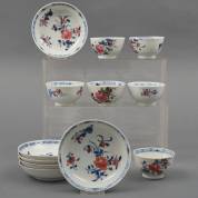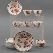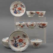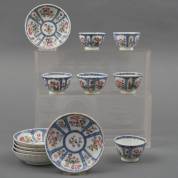 Zes Chinees porseleinen Imari kommetjes en schoteltjes met tuindecor, 18e eeuw -randchipjes, drie schotels met haarlijn-, 5 × Ø 13,5 cm