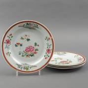 Vier Chinees porseleinen famille rose borden met bloemdecor en landschap op de rand, Qianlong, 18e eeuw -randchips-, Ø 23 cm