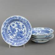 Vijf Chinees porseleinen diepe borden met blauw-wit floraal decor, midden 18e eeuw -randchipjes, één bord met haarlijn-, Ø 21,5 cm