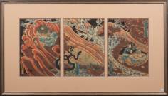 Yoshitsuya Utagawa Yoshitora (actief circa 1850-1880), drieluik: een gevecht met zwarte magie in de bergen, Japanse houtblokdruk, samen ingelijst -defecten aan randen papier-, totale beeldmaat 35 × 79 cm