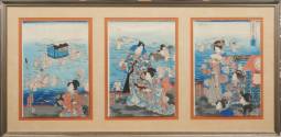 Vermoedelijk Utagawa Yoshiiku (1833-1904), rivieroversteek, vermoedelijk bij de Oigawa, Japanse houtblokdruk, drieluik, 19e eeuw, gezamenlijk ingelijst, totale beeldmaat 38 × 90 cm
