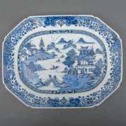 Chinees porseleinen octagonale serveerschaal met blauw-wit rivierlandschapsdecor, Qianlong -randschilfers-, 33,5 × 26 × 5 cm