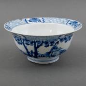 Chinees porseleinen klapmutskom met blauw-wit decor: lange lijzen in tuin, centraal drie zotjes langs de waterkant, Chenghua gemerkt, Kangxi -twee barsten, gelijmde scherf, ontbrekend scherfje, randchips, lijmresten-, 10 × Ø 20,5 cm